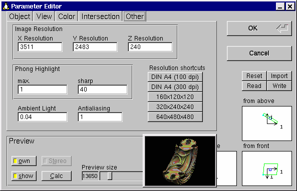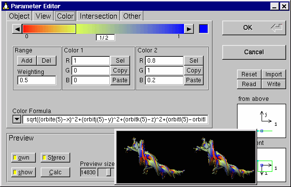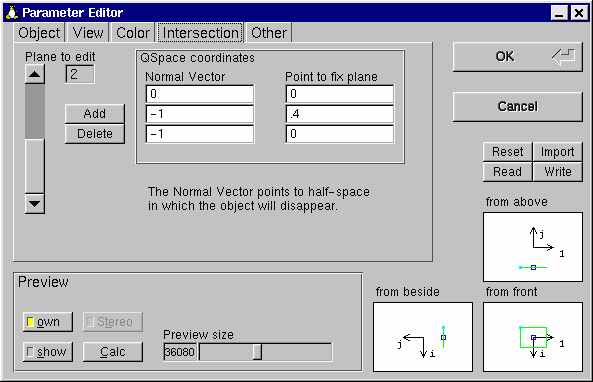 Is used to define intersection planes. The scroll bar on the left has the same purpose as the one in the "Color Editor" described above: to select the object to edit. The buttons "Add" and "Del" also work like above, one adds a new plane, the other deletes the selected plane. There may be between 0 and 20 intersection planes. A plane is defined by its normal vector (pointing into the half-space in that the object should disappear) which must not be zero, and a point on that plane. (See also section 4.3)