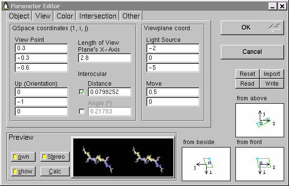 Here is the place to define how the object should be viewed. A view plane (on which the fractal gets projected) is defined by the parameters View Point, Up (Orientation), Move, Length of View Plane's X-Axis and Interocular Distance. The Light Source is also defined. (See descriptions in Section 4.1).
